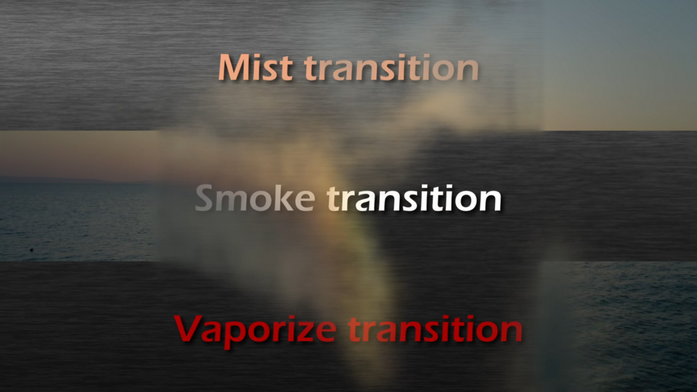 Mist, Smoke, and Vaporize transitions are particle-based transitions for DaVinci Resolve, providing creative ways to transition from an element to another or to make an element vanish.